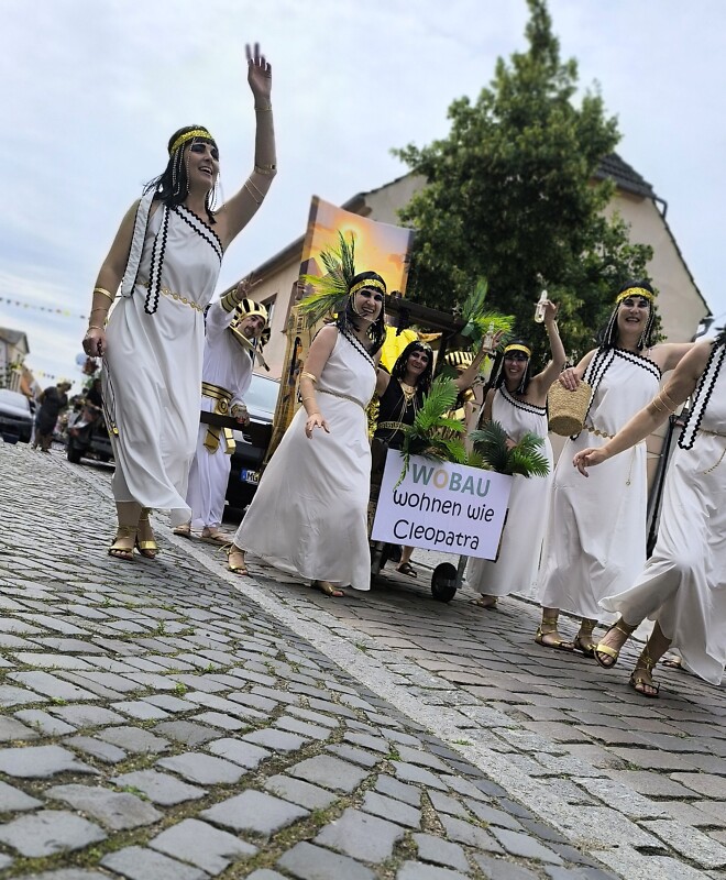 Und dieses Jahr wurde es richtig majestätisch – denn die Wohnungsbaugesellschaft mbH  Malchow verwandelte sich kurzerhand in ein ägyptisches Königshaus. Unter dem Motto „Wohnen wie Cleopatra“ zogen Mitarbeiterinnen und Mitarbeiter in goldenen Gewändern, funkelndem Schmuck und dramatischem Lidstrich mit ihrem prachtvoll gestalteten Wagen durch die Stadt. Und wer ganz genau hinsah, konnte sogar eine Sphinx am Wagen entdecken - sie hat sich aber nicht bewegt – vermutlich wohnungslos 😊.